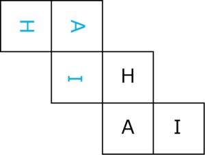 「A」「H」「I」が書かれた正方形のシールを、向かい合う面の文字およびその向きが一致するように立方体の各面に貼り付けてサイコロを作る。