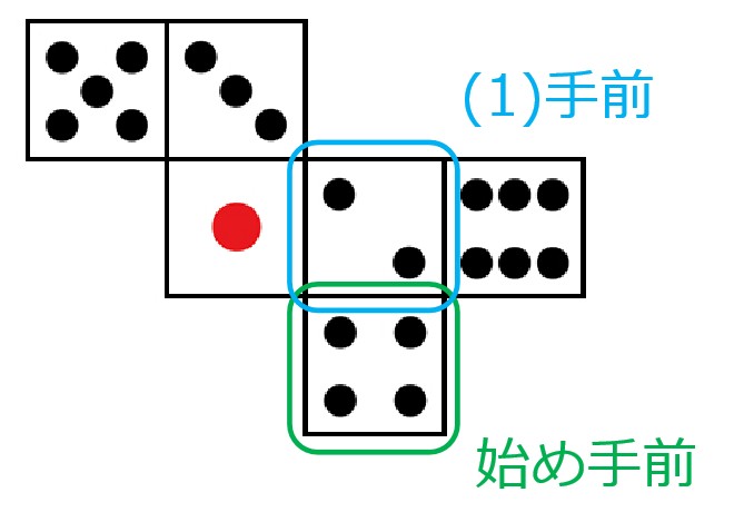 図のサイコロを手前へ1回転がすと、2の目がスライドしてきて手前に来ます。