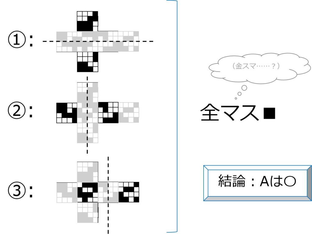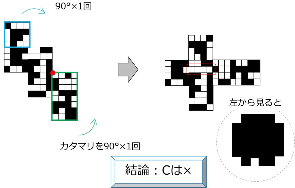 影になる条件は、「展開図を組み立てたときに」向かい合う面の各マスが黒であること。